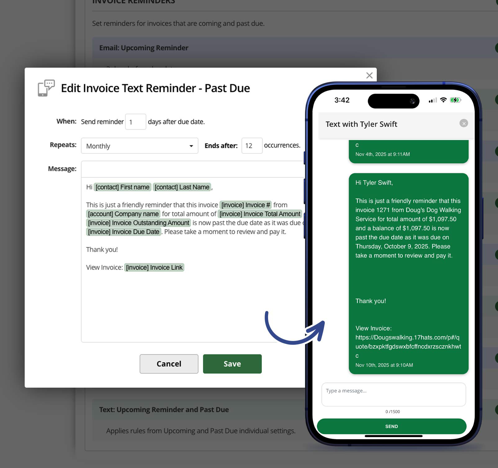 Never chase a client again. 17hats Texting automatically follows up on past due Quotes, Contracts, Questionnaires, and Invoices. You can stay professional and consistent without the hassle.